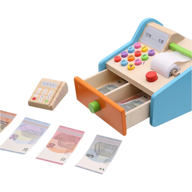 1 Set Wooden Toy Kids Supermarket Cash Register Electronic Toys Foods Basket Money Children Learnin
